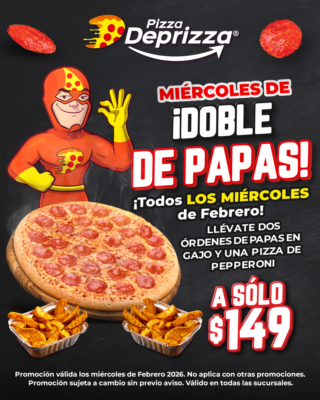 Deprizzer@ disfruta nuestro MIÉRCOLES DE DOBLE DE PAPAS 🤩 Llévate: 🍟🍟 2 órdenes de papas en gajo 🍕 1 pizza de pepperoni ¡TODO por solo $149!